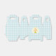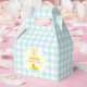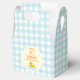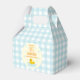 En lycklig anka! Första födelsedag med gummi anka och bubblor mot ljusblå gingham och gult av blek med orange text