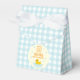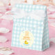 En lycklig anka! Första födelsedag med gummi anka och bubblor mot ljusblå gingham och gult av blek med orange text