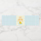 En lycklig anka! Första födelsedagen med en gummianka och bubblor mot en ljusblå gingham och blekgul bakgrund med orange text