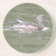 Denna söt sandsten underlägg ett foto av ett vackert brunt anka med ljusblå fjädrar från vinge. Anka simmar mycket på en lugn sjö. Man kan till och med se speglingen av denna fantastiska fågel på vatten.