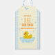 En lycklig anka! Första födelsedagen med en gummianka och bubblor mot en ljusblå gingham och blekgul bakgrund med orange text
