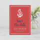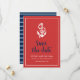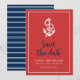 Stilfull nautisk "Spara datum" med ankare och orden "spara datum" i en stilren blå skrift mot en röd bakgrund med vit kant. Korten har ett mönster av vita ränder mot en blå bakgrund på baksidan. Ta en titt på andra bröllopsprodukter här https://www.zazzle.com/rosewoodandcitrus/gifts?cg=196540141241316965&rf=238364477188679314