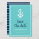 Stilfull nautisk "Spara datum" med ankare och orden "spara datum" i ett stilrent blått typsnitt mot en turkos bakgrund med vit kant. Kortet har ett mönster med vita ränder mot en blå bakgrund på baksidan. Kolla in andra bröllopsartiklar här https://www.zazzle.com/rosewoodandcitrus/gifts?cg=196540141241316965&rf=238364477188679314