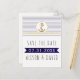 vykort för guld, sjöankare och rand sjömansfartyg bröllop spara datum. Denna vackra och moderna utformning av badbröllop på stranden visningar vågrät rand i marinblått och guld på kortets övre del, en marinblå banderoll och ett ankare i guld glitter i en vit cirkel med guld kontur.