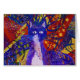En purpurfärgad smokingkattunge sitter med hans tassar neatly vikta. Bak honom som är röd, gult, orange, blått och grönt lappar av färg bildar en läcker och vid liv bakgrund. Exponerar av limefrukter, crimson, bärnsten, och violeten görar strimmig till och med målningen. Trianglar pricker, görar strimmig och cirklar rusar till och med fiestaen av fräknar hänrycker in i himmel. Lavendel- och indigoblåtttårar är skjulet för hans bortgång, även om det finns mycket glädje på hans ankomst.