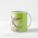 Personlig kaffe mugg som har en nära anslutning till en Anna Hummingbird med blommor av grönt och magenta rosa och som flyger över ogenomskinlig lila salvia blommor. Anpassa enkelt med en namn eller text för att skapa en vacker och unik bord-dekoration för hummingbird, trädgård och älskare. Foto taget i Pasadena, Kalifornien.
