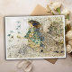 Mjuk och romantisk, med hoppingivande sväljande uppåt, firar detta kort figur skönhet och detaljer i kläder, bakgrund och blommor. Vintagen illustreras av Annie Fransk.