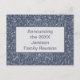 Familjeåterföreningarna är perfekter att samla, byta historier om händelser under det senaste året och skapa nya minnen. Detta meddelande om inbjudan är ett billigt sätt att informera alla om din händelse. Bakgrunden har en mosaik design av blått i sidled och grått färg. Anpassa dig snabbt med året och din familj namn på framsidan och din händelseinformation på baksidan. Vår familjeåterförening växer ständigt. Om du är tittar för något du inte kan hitta kontaktar du mig och jag kan anpassa något speciellt för din händelse.