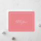 Anpassa ditt namn i vit skripttext på persikobakgrunden med meddelande på baksidan eller lämna tomt för handskriven anteckning.