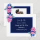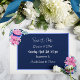 Personlig bröllop spara datum med söt vattenfärgens rosa och blåa blommor med vitt teckensnitt. Tema elegant blommigt bröllop. Lägg till ett pars foto i området Anpassa. s.