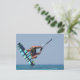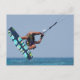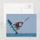 Kitesurfer som flyger genom himlar med vatten-besprutning utanför sitt bord.