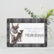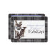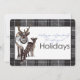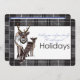 Den här charmiga julkortet har en handillustrerad ren och kalv som står tillsammans mot en ren vit bakgrund, inramad av en snygg rand i svart och grå rutig mönster. Elegant skrivstil och modern typografi förmedlar det hjärtliga budskapet "Vi önskar dig och din familj en magisk jul". Perfekt för att sprida vinterglädje, detta kort blandar rustik skogsvärme med modern design för en festlig och mysig känsla. Texten på baksidan är helt anpassningsbar så att du kan skicka ett unikt meddelande till dina mottagare.