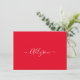 Anpassa ditt namn i vit skripttext och meddelande (eller lämna tomt) på röd bakgrund. Klicka på “Anpassa” för att ändra färger och typsnitt.