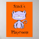 Detta är Snickerdoodle, en av de skrattande kattfigurerna i trycket "Femtio glada katter". Alla 50 katter kan blandas och matchas för att dekorera ett barns rum. Denna version är en del av serien "Toy Matching" och har digitalt ändrats för att komplettera färgerna hos Fisher Price, Little Tikes, Playskool och Megabloks-leksaker samt Garanimals och Carter's kläder.