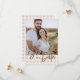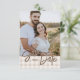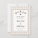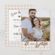Personlig kort för att spara datum med en fotomall med beige gingham-mönster och vacker brun script-teckensnitt. Framsidan visar 'Spara datum' delvis över fotot med en gingham-kant längs botten. Baksidan ger plats för parets namn, bröllopsdatum och bröllopsplats. Perfekt för rustika, landsbygd eller lantbruksstilsbröllop.
