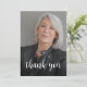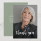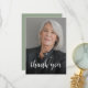 På framsidan av denna 70-års inbjudan finns gästens foto med orden "tack" i elegant vit kalligrafiskrift. En mörk skärm hjälper till att få texten att synas. Anpassa baksidan med ditt personliga meddelande i vit sans serif-teckensnitt och ditt namn i skrivstil på en sälggrön bakgrund.