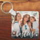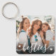 Skapa en personlig souvenir med denna anpassade familj eller barn-foto-nyckelring, som nu har en söt ny design på framsidan. Layouten inkluderar utrymme för ett favoritfoto med ordet "besties" skrivet längst ner i ett flytande skrivstil, accentuerat av några små hjärtdetaljer. En subtil svart gradient sitter bakom texten för att den ska sticka ut utan att överrösta bilden.