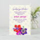 Öppet hus-examensinbjudan med djärva hibiskusblommor. Perfekt för en dotters examen från gymnasiet. Hennes namn står i lila skrivstil högst upp med datum, skolnamn och klass nedan. "Öppet hus" står i fet mörk rosa med mer text nedan för festtid och plats. Röda, lila och rosa blommor längst ner, och bakgrund av fallande examenshattar, som fortsätter på baksidan över en ljus rosa bakgrund.