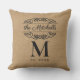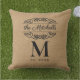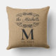 Rollig och söt utomhus kastkudde med rustik taupe säckväv stil textil look med antika blommiga filigranska banermotiv. Med utrymme att anpassa eller anpassa med familjenamn, monogram och etablerat år datum efter eget val.