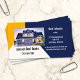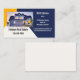 Visitenkort med eget foto av dig själv eller ett hus på en geometrisk designbakgrund i off-white, ocker och mörkblått.