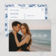 Letar du efter ett stilfullt sätt att tillkännage din bröllop? Detta anpassningsbara fotospåminnelsekort låter dig ladda upp ditt favoritförlovningsfoto medan designen hålls polerad och modern. Den eleganta typplaceringen passar mörkare kläder och strandmiljöer, och baksidan visar upp ett tidlöst blå chinoiserie-mönster för en klassisk finish. Perfekt för bröllop vid kusten, moderna par eller någon som vill ha en förfinad och personlig touch.