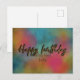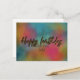 Modern och trendig personlig födelsedagsdesign för vykort med texten "Grattis på födelsedagen" skriven i falskt guld glitterstil på en färgrik akvarellbakgrund.