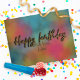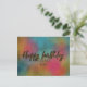 Modern och trendig personlig födelsedagsdesign för vykort med texten 'Grattis på födelsedagen' skriven i falskt guld glitterstil på en färgrik akvarellbakgrund.