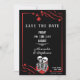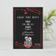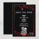 Meddela din gotiska bröllop i stil med denna anpassade dödskalle-kärleksparet Spara datumet som presenterar röda rosor och dramatiska mörka romantiska vibbar.