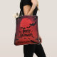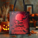 Denna anpassade Halloween-handväskor har en kuslig röd måne med flygande fladdermöss, perfekt för trick-or-treating eller som en festlig accessoar för Halloween-fester. Personifiera den med ditt namn för att göra den unik. Bra för fans av kusliga och gotiska mönster som vill sticka ut under Halloween-säsongen.