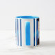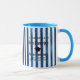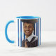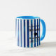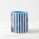 Personlig mugg med herrporträtt för en examen med ett mönster av blå linjer i bakgrunden och klass, examenens namn, examen, universitetsnamn och en examenshatt på baksidan. För att skapa en utskuren bild, beskär din bild till önskat motiv och använd verktyget "ta bort bakgrund".
