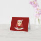 Lyckönskningskort med en illustration av en söt leende glad flicka med kort blondt hår, hon har en röd och vit tomte kostym och håller en present; med redigerbar textmall för ditt namn eller meddelande, julfirande design med röd bakgrund