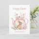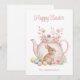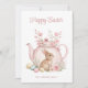 Anpassad kanin & rosa blomsterte-kopp Glad påsk-kort. Med en fantasifull kanin inklämd mot en rosa blomsterte-kopp, är denna cottagecore-design accentuerad med pastellfärgade ägg och mjuka körsbärsblommor. Personligad med ditt familjenamn.