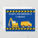 Cool anpassad konstruktionsgravare grattis på födelsedagen postkort till en pojke som älskar gula konstruktionsfordon i svart och gult. Rolig blå fordonsfestdekor för barn som älskar bilar och dumper. Anpassa med ditt barns namn under det svarta och gula försiktighetsbandet med ett personligt grattis på födelsedagen-meddelande som inkluderar deras namn och ålder.
