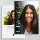 Fira din examen i stil med vårt moderna fotobaserade examenskort "Tack", ett snyggt och hjärtligt sätt att uttrycka din tacksamhet. Detta anpassningsbara kort har en ren, modern design med utrymme för ditt favoritfoto/foton både på framsidan och baksidan (använd samma eller olika bilder) - perfekt för att visa upp dina seniorporträtt eller en minnesvärd examensögonblick. Anpassa texten för att göra ditt meddelande verkligt personligt, oavsett om du tackar vänner, familj eller mentorer för deras stöd.