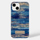 Elegant abstrakt blue och guld-färglinjer iPhone 14 fodral med en personlig namn-mall. En djärv, modern konst mönster i blues och guld löv-grafik som skulle ge en snyggt till mamma på Mor dag, anpassningsbar närvarande för en dotters födelsedag eller unika Valentindagspresent till en flickvän.