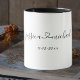 Elegant, svart och vit personlig, bröllop kaffe mugg. Newlyweds namn trycks i mitten i mugg i kursiv stil och gås med av kalligrafiskt hjärta mellan namn. Det är dessutom personlig med en anpassningsbar-höger under namn. Det kan representera ett bröllop- eller årsdatum.