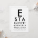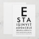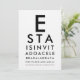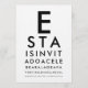 Bjud in dina gäster på det mest iögonfallande sättet med denna anpassade ögonkartspartys-inbjudan, inspirerad av det ikoniska ögonläkartestet! Designen börjar med det djärva, klassiska ”E” och fortsätter med allt mindre rader - precis som ett riktigt Snellen-diagram - kreativt förvandlat till din evenemangsinformation. Anpassa varje rad med namn, datum, plats och firandemeddelande för en smart, professionell och verkligt minnesvärd anmälan.