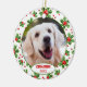 Söt december jul granhängsmycke med plats att anpassa eller anpassa med namn du väljer i ett elegant typsnitt manus, ett personligt foto av din hund eller katt och år datum du väljer. Med en snygg säsongsbetonad grön julbärsblad och röda bär mönster bakgrund som dekoration. Unika minnen souvenir som din pälsig bebis mor- och farföräldrar, andra familjemedlemmar eller dina vänner kommer att älska!
