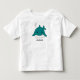 Rolig tecknad blå och vit haj med stora spetsiga tänder och små svarta ovaler för ögon som blåser bubblor. Nedan finns en mall för att lägga till ditt barns namn för att anpassa.