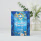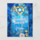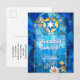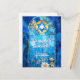 Fira Hanukkah med ett vykort som strålar av glädje och tradition! Detta glada Hanukkah-vykort har en livfull glasmålning i olika nyanser av blått, centrerad runt en framträdande David-stjärna. Hälsningen ”Hanukkah Sameach!” (Glad Hanukkah) visas elegant i fet vit text, med utrymme för egen text nedan, vilket gör varje kort unikt.