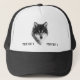 Grått varg Canis lupus animal porträtt i svartvitt. Elegantens truckerkeps för alla. Anpassade. Du kan ändra eller ta bort två texter under bilden. Du kan också överföra den här designen till en annan valfri produkt, bara använda ett alternativ till högerna av den här beskrivningen.
