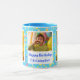 Fira deras speciella dag med en personlig-dag-mugg! Den här charmerande designlayouten har en mjuk baby blue bakgrund som är försedd med en handmålad vattenfärgad kondensat som ger ramar tre anpassningsbars bilder. Ramar i två porträtt-format till lämnad och höger, parad med ett vågrät i mitten, ger en visning för perfekt av dina favoritminnen. Under mitten bild finns ord "Grattis på födelsedagen", men du kan anpassa texten så att den omfattar alla hälsning. Lägg till namn efter eget val om du vill ha en personlig beröring för extra under bilden av landskapets orientering. Varje fotografi är lätt att ersätta och skapar mugg en verkligt unik och tankeväckande gåva som kommer att omhuldas i åratal till komen!