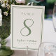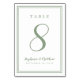 En mall för valfritt nummer, denna enkla, minimalistiska och eleganta design för bröllopsbordnummer har en modern design med en dubbel ramkant i salvia grön på en skarp vit bakgrund. Chic design ger tidlös men modern förfining. Anpassa bröllopsbordets design med ditt namn, bröllopsdatum och bordnummer i trendig salvia grön bokstav och skrift. Baksidan av kortet är en dublett av framsidan. Anpassa enkelt och beställ en för varje bord med de individuella bordnumren.