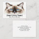 Det här affärskortet innehåller en charmerande, mjuk vattenfärgad illustration av en sälpunkt Ragdoll-katt med träffande blå ögon. Utformningen är ren och elegant, med gott om tomt utrymme för att säkerställa att kontaktinformationen är tydlig. På kortets framsida finns ett dedikerat utrymme för ditt cattery namn och mobilt nummer, medan baksidan ger plats för ägarens namn, specialisering (t.ex. specifika kattraser), e-post adress, social medieferens och plats. Denna mångsidiga och fullständiga mall för anpassade är perfekt för kattuppfödare, katterier eller någon i husdjursbokningsföretaget som vill ha ett professionell men ändå vänligt utseende.