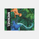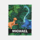 Denna dinosauridesign är underbar för dinosauer älskare i ditt liv. Den dinokemiska löv-filten har en trex, triceratops, brontosaurus och raptor och kan anpassas med pojkens eller flickans namn.