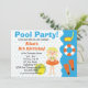 I somras har bassäng party födelsedagsfest inbjudan en liten flicka med blont hår omgivet av hennes bassäng leksaker, inklusive ett innerslang, strand boll, flippar och en simma mask. Fullständigt anpassade.