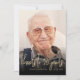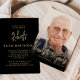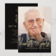 Framsidan på denna inbjudan till 90-årsfirande visar hedersgästens foto med en guldfärgad textöverlagring. Orden "skål för 90 år" visas i modern guldfärgad handskriven stil, följt av hedersgästens namn och födelsedag i sans serif-teckensnitt. En mörk skärm hjälper till att få texten att sticka ut. Anpassa baksidan med namn och festdetaljer i guld på svart bakgrund. Ett bra sätt att fira någon som fyller nittio!