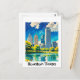 En pulserande vattenfärgsmålning av Houston-skylinen med ikoniska skyscraper Citysslet är framtill en bred linje som är sammanfogad med lush grönt träd, som skapar en känsla av storhet och naturskönhet. Himmel är ett tydligt blått område med flytande vita moln, som bidrar till den allmänna känslan av optimism och energi.