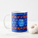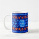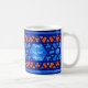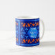 Ett söt vitt mugg med traditionellt islamiskt trellis mönster i två blå nyanser och orange fram och tillbaka. Det finns en panel i mitten i designen där du kan placera det namn du behöver. Den här utformningen har handmålats av Judy Adamson.