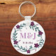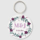 Lavendel- och violetta blommor krans med personliga monogram och bröllopsdatum nyckelring. Rolig liten bröllopsgåva dekorerad med en vacker blomsterkrans. Söt och praktisk sak som firar din kärlek.